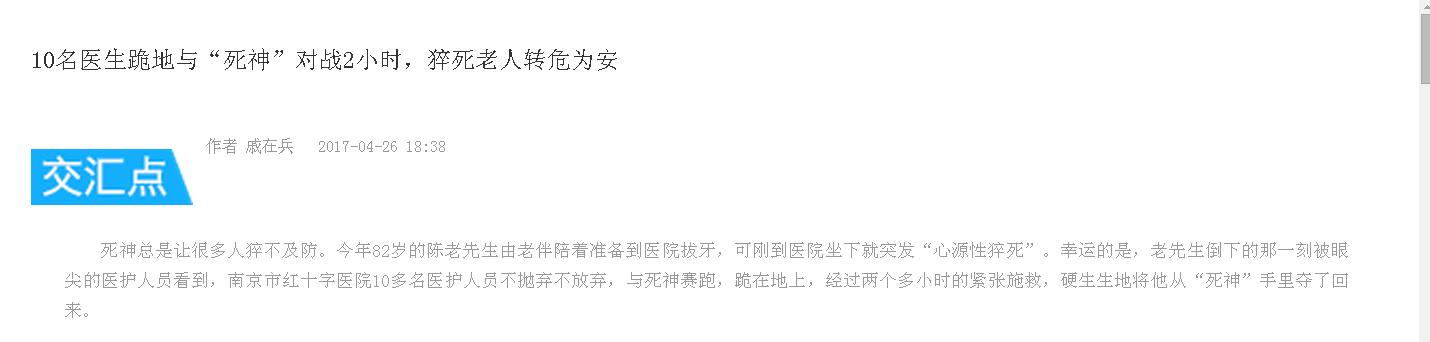 死神總是讓很多人猝不及防。今年82歲的陳老先生由老伴陪著準(zhǔn)備到醫(yī)院拔牙,可剛到醫(yī)院坐下就突發(fā)“心源性猝死”。幸運(yùn)的是,老先生倒下的那一刻被眼尖的醫(yī)護(hù)人員看到,南京市紅十字醫(yī)院10多名醫(yī)護(hù)人員不拋棄不放棄,與死神賽跑,跪在地上,經(jīng)過(guò)兩個(gè)多小時(shí)的緊張施救,硬生生地將他從“死神”手里奪了回來(lái)。