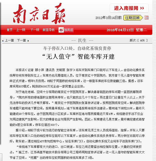 將車開到車庫門口就可以下車走人,由自動化操作系統(tǒng)幫你將車停到車位上,車庫內(nèi)也無需值班人員。位于南京紅十字醫(yī)院內(nèi)、我市首個無人值守智能車庫昨正式開建,明年5月投用。相較于同面積的傳統(tǒng)車庫,這一新型車庫的車位數(shù)能翻三倍。據(jù)悉,該車庫采用BOT模式,耗資的6000萬元全由一家民營企業(yè)出資。