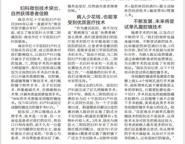 南京市紅十字醫(yī)院婦產(chǎn)科主任陸樂(lè)告訴記者,成立醫(yī)聯(lián)體對(duì)我們影響很大,以前婦產(chǎn)科只能開(kāi)展全子宮切除術(shù),經(jīng)過(guò)2年多的發(fā)展,三、四級(jí)手術(shù)的開(kāi)展能力明顯提升,現(xiàn)在已經(jīng)形成以微創(chuàng)為主體的婦科手術(shù)治療體系,可以開(kāi)展各類(lèi)腹腔鏡、宮腔鏡、陰道鏡等鏡下微創(chuàng)手術(shù),進(jìn)行腹腔鏡下附件手術(shù)、全子宮切除術(shù)、卵巢癌減滅術(shù)、宮頸癌根治術(shù)等,開(kāi)展各類(lèi)盆底修復(fù)類(lèi)手術(shù)。“98%的手術(shù)都能采用腹腔鏡技術(shù)。僅今年3月份,婦產(chǎn)科成功完成腹腔鏡及宮腔鏡手術(shù)51臺(tái)。”