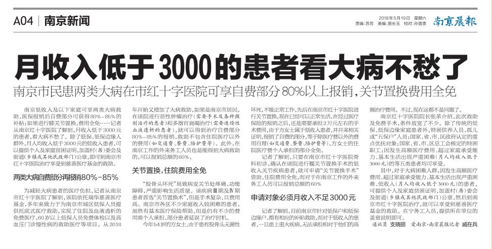 南京低收入及以下家庭可享兩類大病救助,醫(yī)保報(bào)銷后自費(fèi)部分可獲得80%-85%的補(bǔ)貼;如果進(jìn)行膝關(guān)節(jié)置換,費(fèi)用全免……記者從南京紅十字醫(yī)院了解到,月收入低于3000元的患者,看大病不愁了。除了低保、低保邊緣人群外,月人均收入低于3000元的低收入患者,可以提供個人及家庭貧困證明,加蓋村(居)委會及街道(鄉(xiāng)鎮(zhèn)或其他民政部門)公章,即可到南京市紅十字醫(yī)院治療享受到慈善醫(yī)療基金的救助。