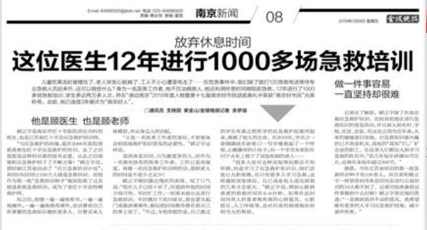 而作為一名救死扶傷的醫(yī)務(wù)工作者,工作已是高強度。再做一名應(yīng)急救護培訓(xùn)師的話,那陪家人的時間是不是少之又少?顧正宇頓時露出愧疚的表情,嘆了口氣說:“現(xiàn)在兒子已經(jīng)十歲了,但我陪伴他的時間少得可憐。平時忙工作,一到周末就出去進行急救培訓(xùn)。平時偶爾下班回家早,我也要關(guān)起門來做講課課件,貌似把時間都花費在我自己的事上面了。”不過,令他欣慰的是,自己教過的學(xué)生有真正把所學(xué)的應(yīng)急救護技能用起來,挽救了他人的生命。在2018年,學(xué)員之一徐曉晴就在新街口一寫字樓救起了一個呼吸、心跳驟停的小伙子;另一個學(xué)員朱家陽在回寧火車上救下了突發(fā)疾病的老人……